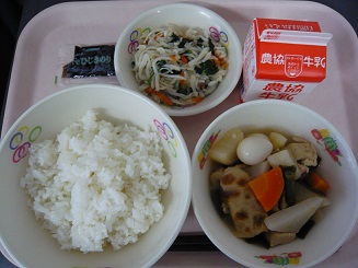 ごはん、含め煮、切り干しの和え物、ひじきのり、牛乳