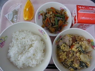 ごはん、卵とじ、五目きんぴら、オレンジ、とろろこんぶ、牛乳