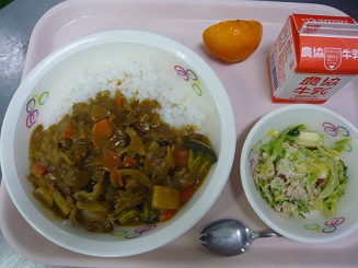 冬野菜カレー、ツナサラダ、みかん、牛乳