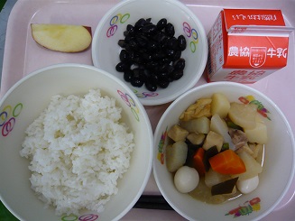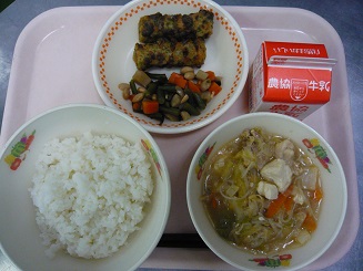 ごはん、とり野菜、五目豆、竹輪の磯辺揚げ、牛乳