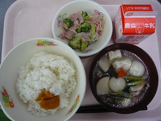 ごはん、白玉雑煮、ごま和え、つぼ漬、牛乳