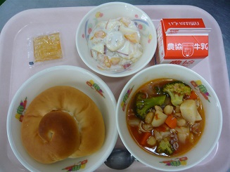 ミルクロール、ポークビーンズ、ヨーグルト和え、りんごジャム、牛乳