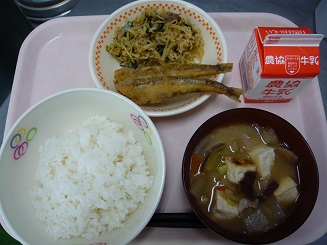 ごはん、メギスのいしる揚げ、切り干し大根のピリ辛炒め、めった汁、牛乳