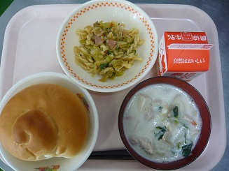 ミルクロール、飛鳥スープ、糠サバパスタ、牛乳