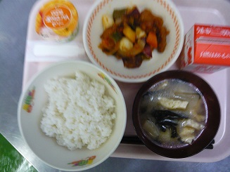ごはん、酢豚、みそ汁、みかんゼリー、牛乳