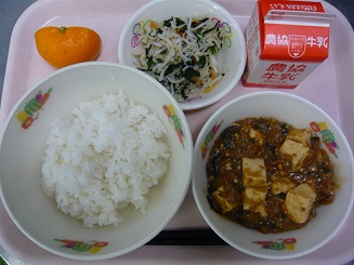 ごはん、麻婆豆腐、磯香和え、みかん、牛乳