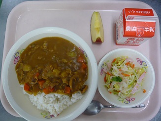 カレーライス、大根サラダ、りんご、牛乳