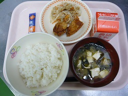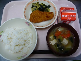 ごはん、チキンフライ、ワカメソテー、みそ汁、牛乳