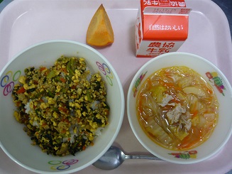そぼろごはん、中華スープ、柿、牛乳
