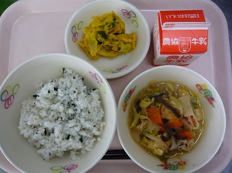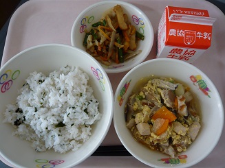 ワカメご飯、たまごとじ、五目きんぴら、牛乳