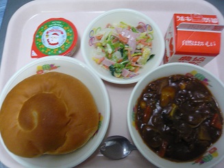 ミルクロール、ビーフシチュー、白菜サラダ、クリスマスゼリー、牛乳