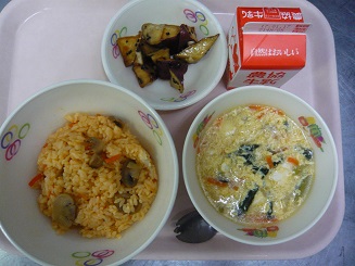 チキンライス、たまごスープ、大学芋、牛乳