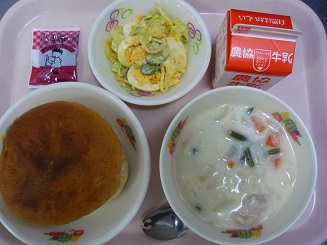 胚芽パン、クリームシチュー、たまごサラダ、クリーム、牛乳