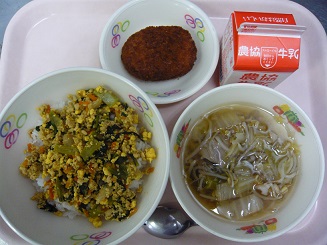 ソボロごはん、中華スープ、コロッケ、牛乳