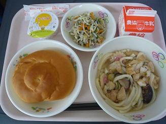 ミルクロール、ジャム、五目うどん、磯香和え、月見ゼリー、牛乳
