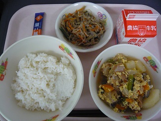 ごはん、卵とじ、五目きんぴら、ふりかけ、牛乳