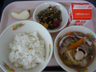 ごはん、八宝菜、小魚揚げ煮、梨、牛乳