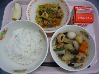 ごはん、含め煮、回鍋肉、りんご、牛乳