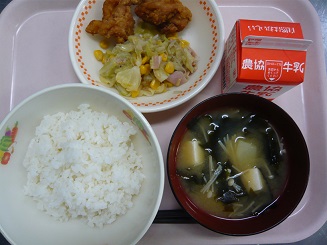 ごはん、とりのから揚げ、コーンソテー、みそ汁、牛乳