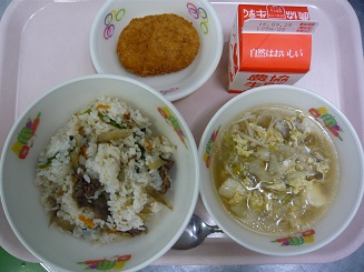 ビーフライス、たまごスープ、コロッケ、牛乳