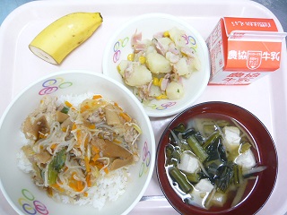 豚丼、みそ汁、ジャーマンポテト、バナナ、牛乳