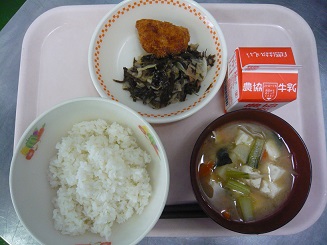 ごはん、竹輪の磯辺揚げ、切り干し大根のピリ辛炒め、けんちん汁、のり佃煮、牛乳
