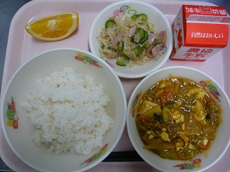 ごはん、豆腐のカレー煮、切り干し大根のナムル、オレンジ、牛乳