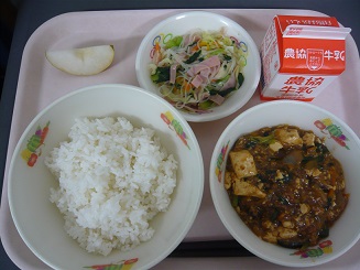 ごはん、麻婆豆腐、中華和え、梨、牛乳