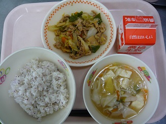 ゆかりごはん、回鍋肉、ワンタンスープ、牛乳