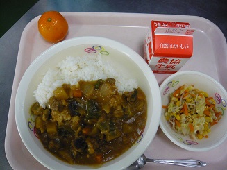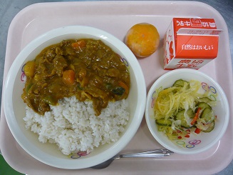夏野菜カレー、金糸瓜サラダ、冷凍みかん、牛乳