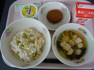 ちらしずし、すまし汁、ミンチカツ、梨ゼリー、牛乳