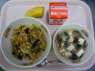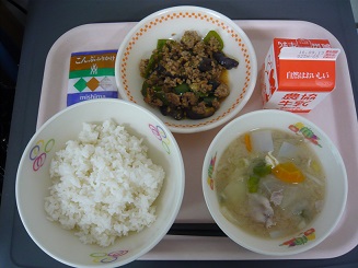 ごはん、豚汁、ナスのみそ炒め、ふりかけ、牛乳