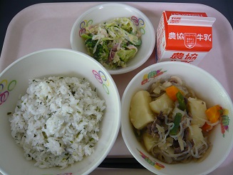菜めし、肉じゃが、ツナサラダ、牛乳