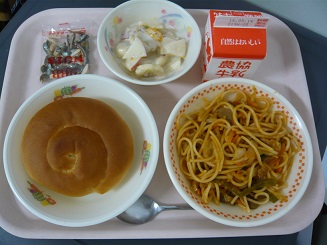 ミルクロール、スパゲッティソテー、ヨーグルト和え、ナッツとさかな、牛乳