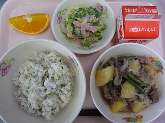 菜めし、肉じゃが、ツナサラダ、オレンジ、牛乳
