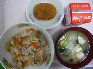 豚丼、かぼちゃコロッケ、けんちん汁、牛乳