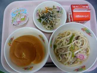 ミルクロール、五目うどん、磯香和え、七夕ゼリー、牛乳