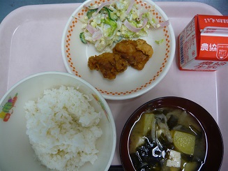 ごはん、とりのから揚げ、キャベツサラダ、みそ汁、牛乳