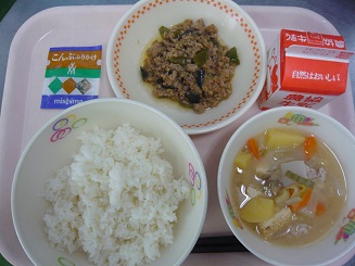 ごはん、豚汁、ナスの肉みそ和え、ふりかけ、牛乳