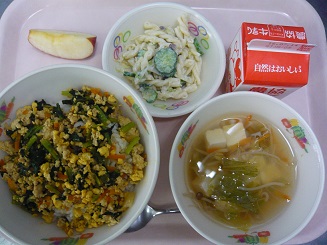 そぼろごはん、中華スープ、マカロニサラダ、りんご、牛乳