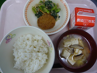 ごはん、ミンチカツ、ごま和え、みそ汁、牛乳