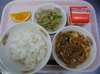 ごはん、麻婆豆腐、もやしナムル、オレンジ、牛乳