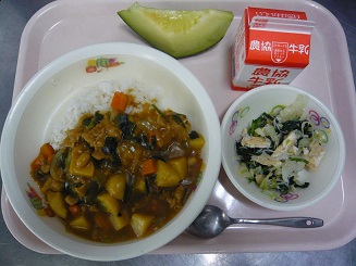 ポークカレー、しらす和え、メロン、牛乳