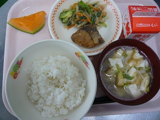 ごはん、ブリの竜田揚げ、ごま和え、みそ汁、メロン、牛乳