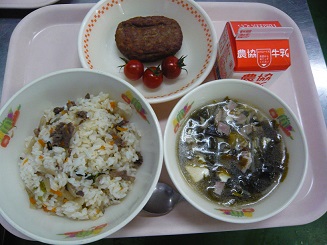 ビーフライス、ワカメスープ、ハンバーグ、ミニトマト、牛乳