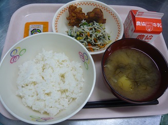 ごはん、とりから揚げ、磯香和え、もぞこ汁、ふりかけ、牛乳