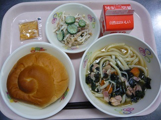 ミルクロール、うどんスープ、カミカミサラダ、りんごジャム、牛乳