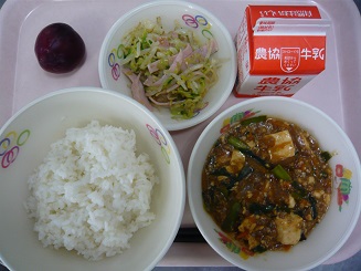 ごはん、麻婆豆腐、もやしのナムル、すもも、牛乳