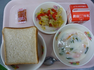 胚芽食パン、クリームシチュー、コーンソテー、イチゴジャム、牛乳