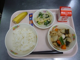 ごはん、含め煮、しらす和え、ふりかけ、バナナ、牛乳